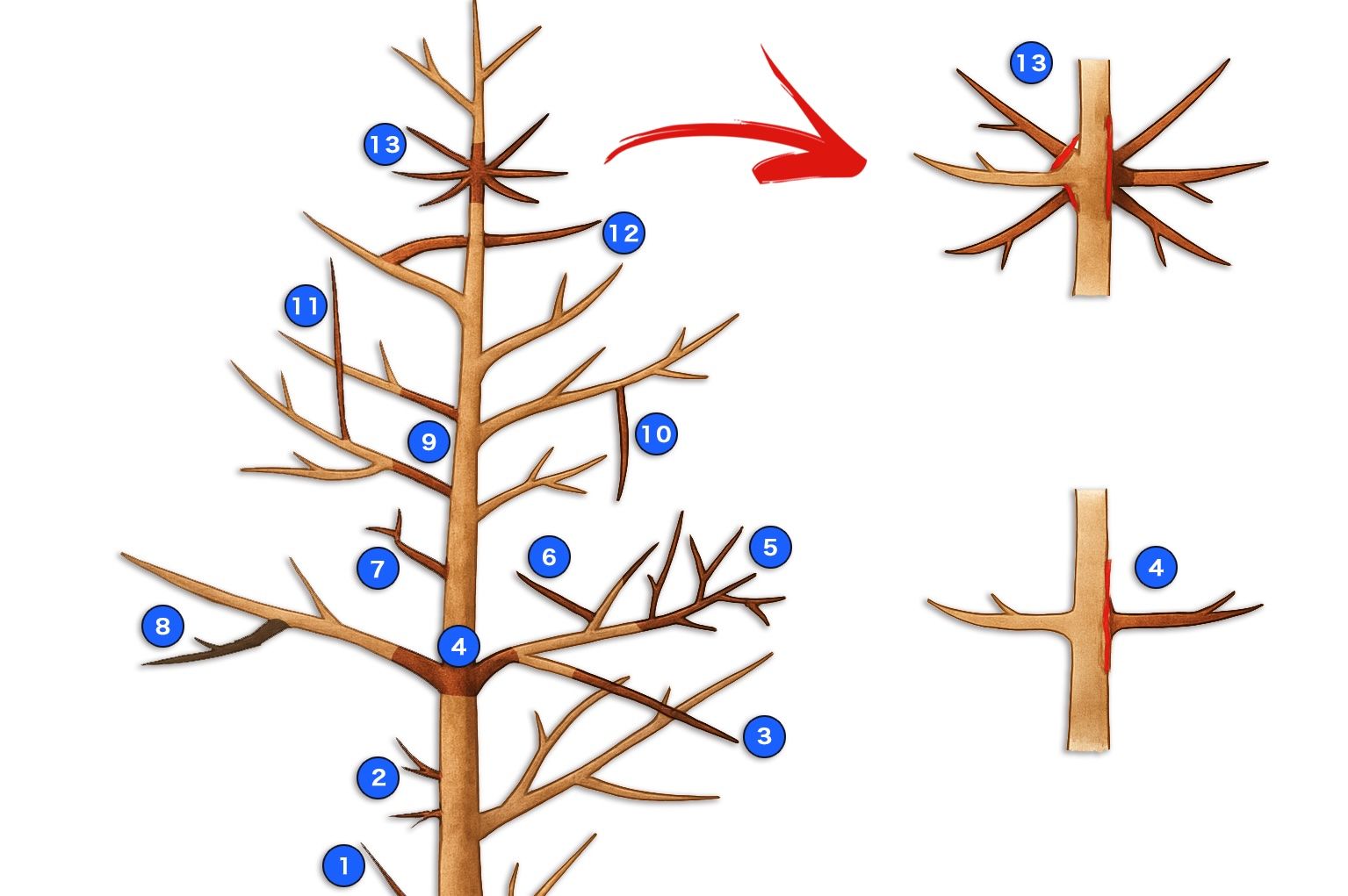 12. Branche qui croise le tronc : 幹切り枝 : kankiri eda